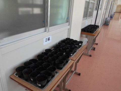 理科でつかうヘチマとヒョウタンの種をポットで育てています。