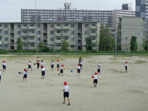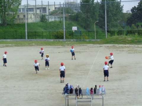 準備体操をし、グラウンドを走った後、今日はボール運動を行いました。