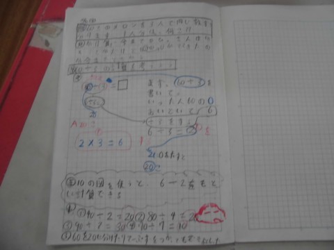 ドット図・テープ図・お金のような図など、60を⑩のまとまりが6個だと考えて3人分に分けるといいことをみんな説明しあっていました。