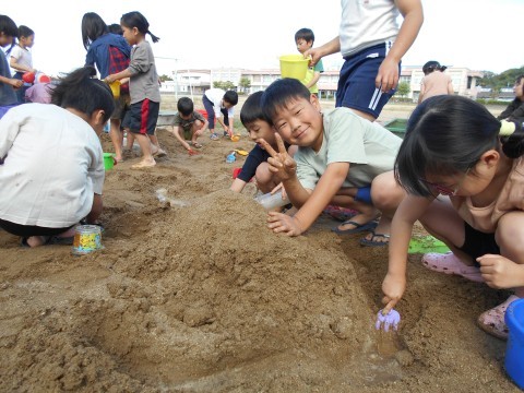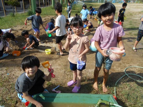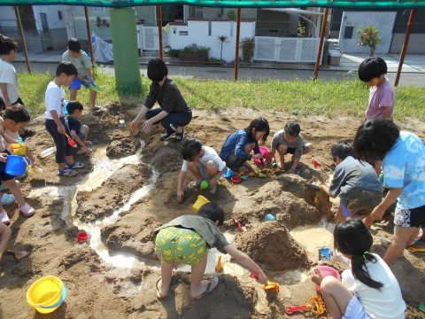 みんなで力を合わせて,砂場に大きな川や池をつくりました。