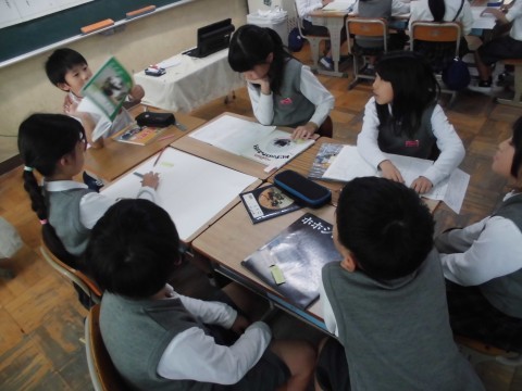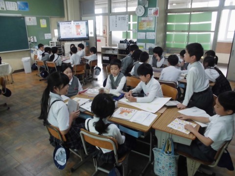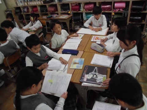 3年生の国語では、「一年生が本を好きになってくれるように、班で1冊本を選んで読み聞かせをしに行かせてもらう」ことを目標として,話し合いの学習をしています。