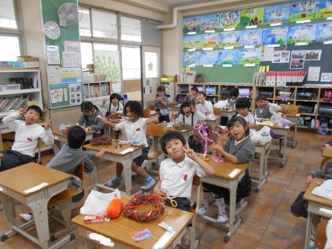 生活科で育てたアサガオのつるをまとめて,リースにしています。