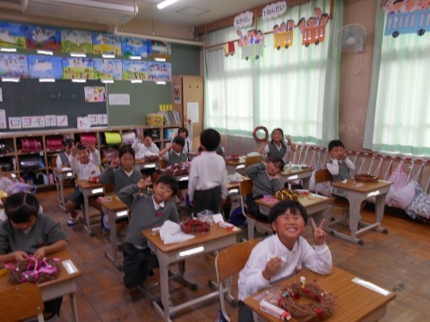 今日は,好きな色のリボンを巻いて,お家から持ってきた飾りをつけました。