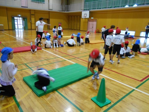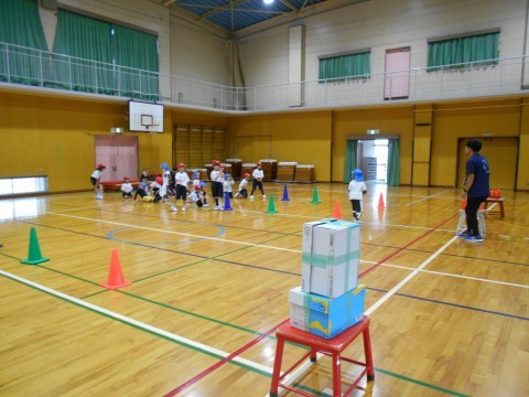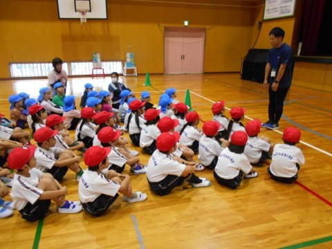 美原ひがしこども園の年長さんがきてくれて,一緒に体育の学習をしました。