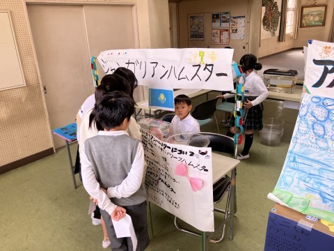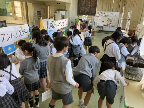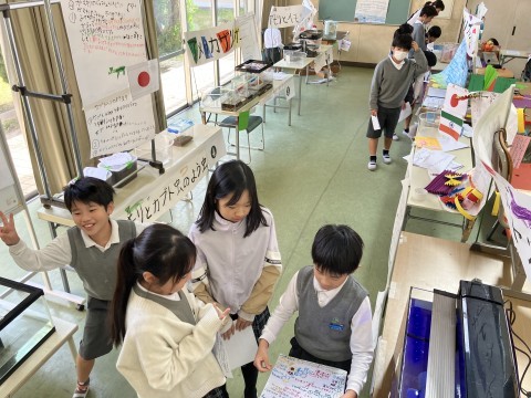 他学年の児童と生きものを通じて交流したり,クイズを出したりして同じ空間で学び合いました。