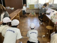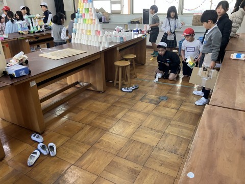 2年生が生活科と図工で作ったおもちゃでゲームやイベントを考え,3年生にルールを発表して,一緒に遊びました。