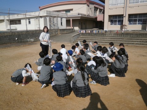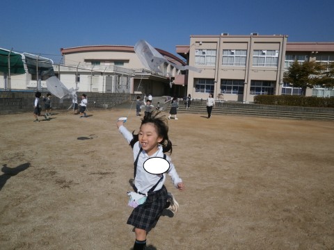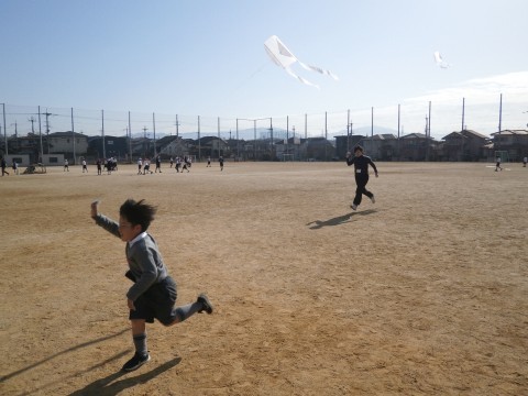 1年生の子どもたちは自分で走って風を起こし,たこを舞い上がらせました。