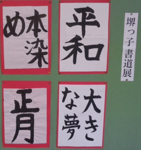 4年生の学年掲示板に掲示している,「堺っ子書道展」の作品です。