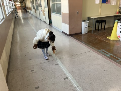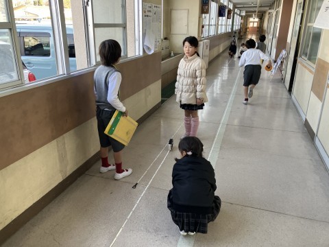 算数の「長い長さをはかってあらわそう」の単元で実際に廊下やさつき野ホールの長さをはかって,測定活動を通じて長さの量感を養う学習を行いました。