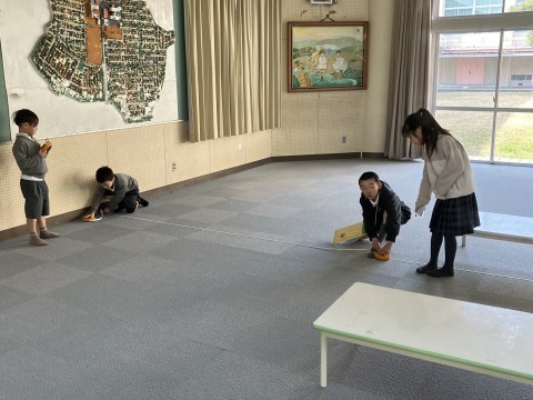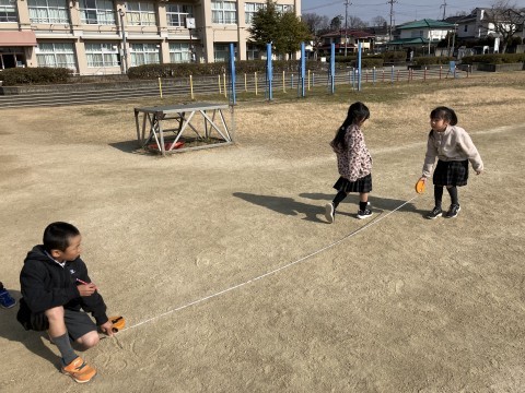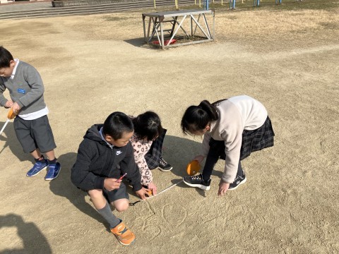 実際にはかってみるとさつき野ホール14mで運動場(長いほうの直線)は125mでした。