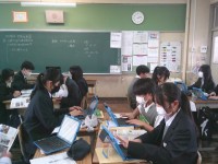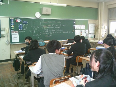 8年生は理科で電流の学習をしていました。回路図の理解がよく進むように,具体物を黒板に掲示しながら説明されていました。