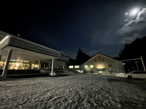 おはようございます。まだ空には月が輝いています。よく見るとたくさんの星がまたたたいております。