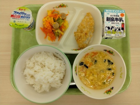 ・ご飯・白身魚フライ・キャロットソテー・野菜の卵とじスープ・ヨーグルト