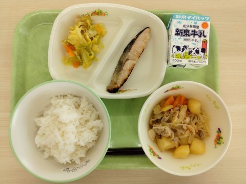 ・ご飯・肉じゃが・鮭の塩こうじ焼き・キャベツの炒め物