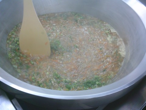 給食場でも,春の雨のようにおだやかに釜の中に入れ,煮込んで作りました。