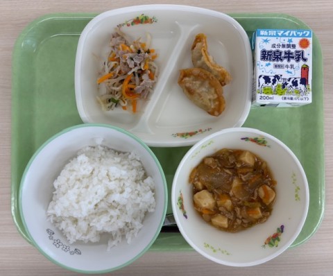 ・ご飯・麻婆豆腐・揚げギョーザ・もやしのからしあえ
