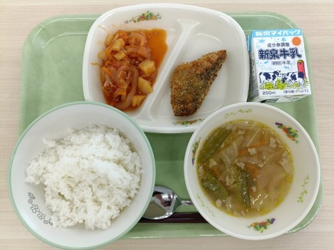 ・ご飯・あじフライ・ミートポテト・春野菜スープ