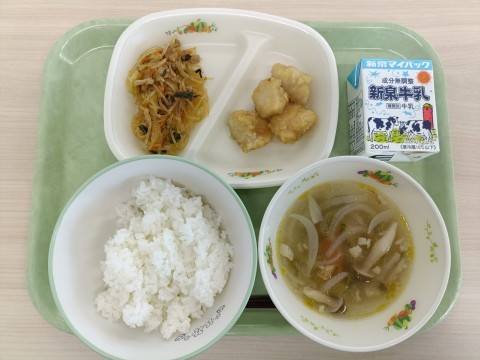 ・ご飯・鶏肉のから揚げおろしソース・タンタン春雨・中華スープ