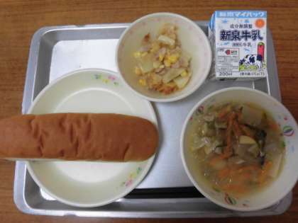 今日の給食は、コッペパン、牛乳、春雨スープ、ツナとポテトのマヨネーズ風焼きです。