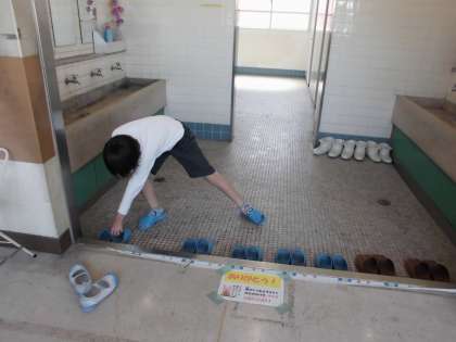 4年生の横のトイレの前を通りかかると,スリッパを揃えている児童に出会いました。