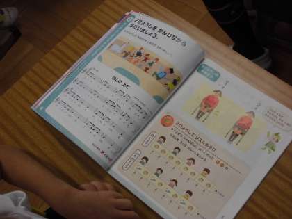 音楽を聴きながら,2びょうしに合わせて手をたたいていきます。