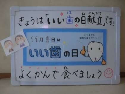 11月8日は,「1(い) 1(い) 8(は)」の語呂合わせで「いい歯の日」です。今日の給食には,噛み応えのある「ごぼうサラダ」と「ミニフィッシュ」でした。しっかりよく噛んで食べることができたでしょうか♪