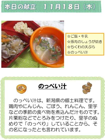 本日の献立は、ご飯・牛乳・豚肉のしょうが焼き・ちくわの天ぷら・のっぺい汁です。