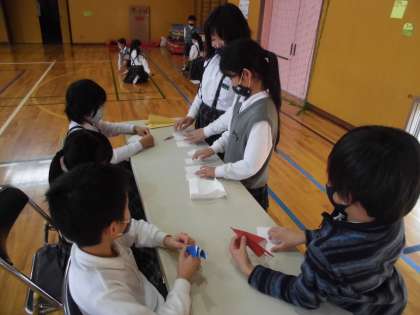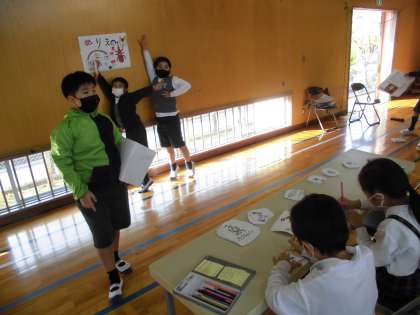 1年生と3年生が東体育館で交流学習を行いました。3年生は,国語の「はんで意見をまとめよう」の学習で「1年生と交流したいこと」について話し合ってきました。その話し合ったことに気を付けながら,「ぬりえ」や「折り紙」,「紙芝居」など,1年生が楽しめるように準備を頑張りました。1年生も景品などをもらって,うれしそうでした。