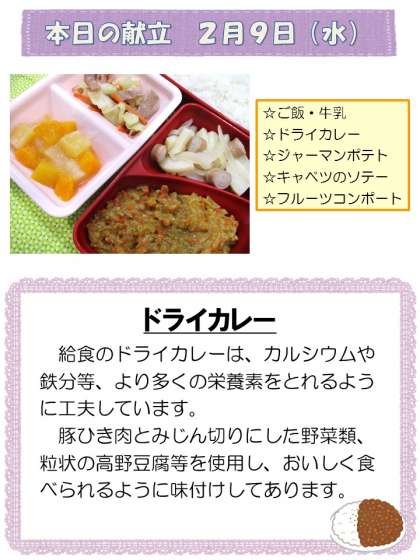 本日の献立は、ご飯・牛乳・ドライカレー・ジャーマンポテト・キャベツのソテー・フルーツコンポートです。