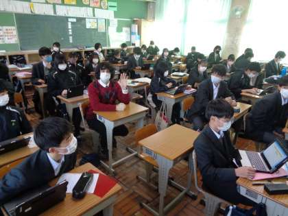 往年のビートルズを彷彿(ほうふつ)とさせる,赤いアーガイルニットにふんわりヘアーの男性が生徒の机で手を振っています。