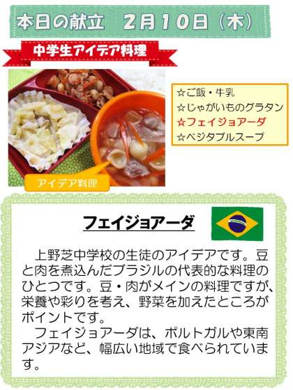 本日の献立は、ご飯・牛乳・じゃがいものグラタン・フェイジョアーダ・ベジタブルスープです。