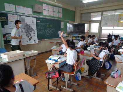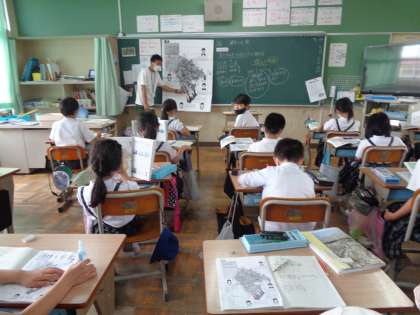 田んぼのマークと果物のマークを見て,「田んぼが多い」ことに気づきました。果物は,南側,高いところに多いことに気づき,なぜだろう?と考えていました。