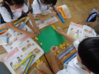 1年生ではまだ,cmやmmなどの単位の学習はしませんが,「何個分やひも」などを使って考え方を理解していきます。
