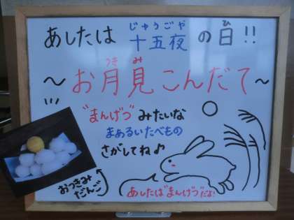明日9月10日は十五夜です。十五夜は秋の美しい月を観ながら,秋の収穫に感謝する行事で「中秋の名月」と呼ばれています。今日は十五夜の行事食で,里芋が入った月見椀とモチモチのみたらし団子を実施しました♪