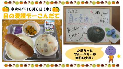 10月10日の「目の愛護デー」に合わせて,今日はかぼちゃとブルーベリーを使った献立でした^^