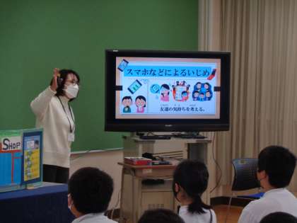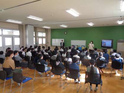 5年1・2組合同で非行防止教室を研修室で行いました。問題行動には様々なものがあります。喫煙・飲酒や万引きやいじめなどなど。
