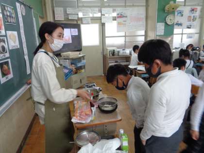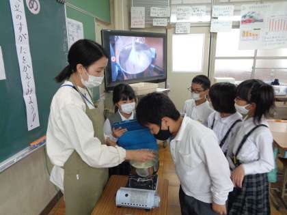 豆腐になる前の「おから」や「豆乳」を見たり,豆乳に「にがり」を入れると「ゆば」ができたり,しだいに豆腐になっていく変化は,こどもたちにとって驚きでした。