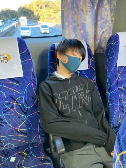 ビンゴで盛り上がった一号車。早起きしたんですね、おやすみ。
