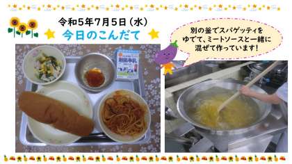 ミートスパゲティは子どもたちに大人気のメニュ—です。今日は堺市産のなす入りでした!ミートソースと合わせると食べやすく、とってもおいしかったですね。