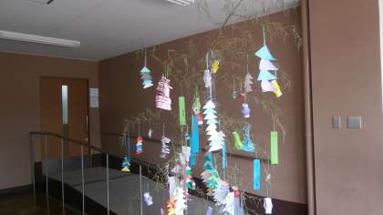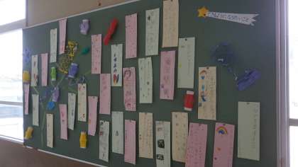 1年1組前廊下に大きな笹飾りがあります。短冊はよく見えるようにボードに貼ってあります。かわいい願い事がたくさん。