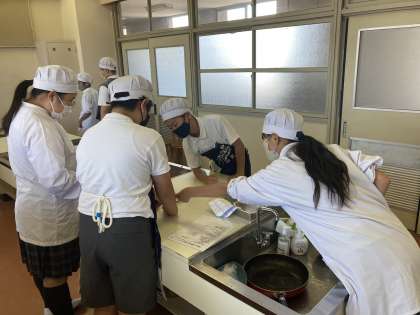 家庭科の授業の調理実習の様子です。野菜炒めをグループで協力してつくっています。