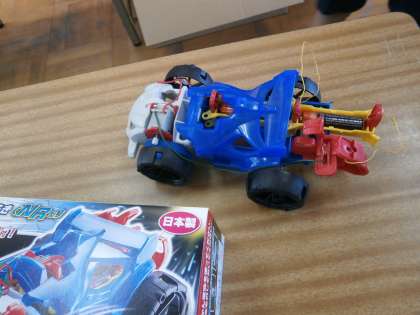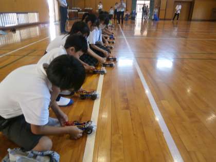 電池の力で走る車を製作し、体育館で一斉に走らせました!