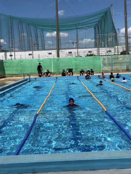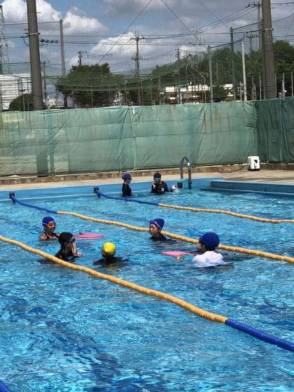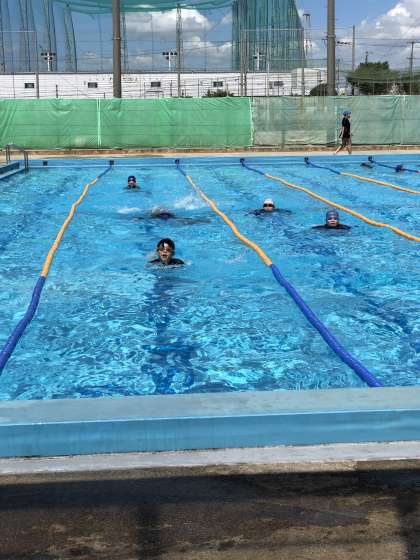 女子は、ビート板を使って練習です。お互いにアドバイスをしあっています。男子は平泳ぎです。今日も暑く、とても気持ち良さそうでした。