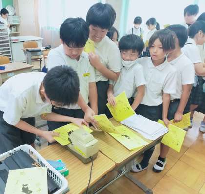 今日はしおり係さんが頑張って作った、しおりをクラスごとに製本しました。