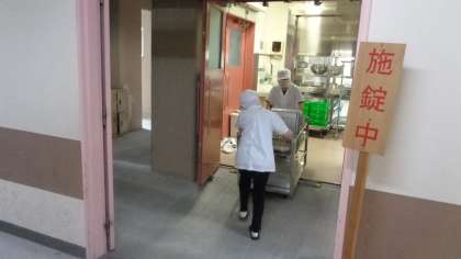 ○調理室からワゴンを運び出し、1階ダムウエーター前へ運びます。