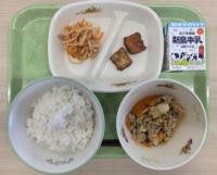 今日の給食(小学校)は、ごはんむらくも汁切干大根の炒り煮厚揚げのしょうが焼き牛乳...