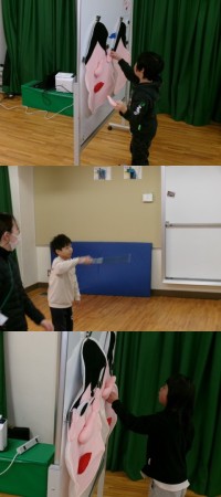 多目的室で、入場から退場まで通して練習しました。器楽では、いろいろな楽器を使って演奏していました。ダンスでは、みんなで棒を持って上げ下げしたり揺らしたりと、楽しく取り組んでいました。