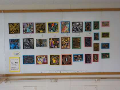 作品交流として、庭代台中学校支援学級生徒が制作した作品を、12月4日(土)まで、本校運動場側昇降口の壁面、本校体育館側エレベーター前壁面に掲示しています。音楽発表会で本校へお越しいただいた際には、ぜひご覧ください。