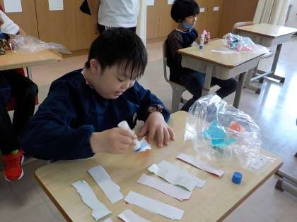 折り紙でこいのぼり作りをしました。のりを折り紙に塗り、元気なこいのぼりができました。