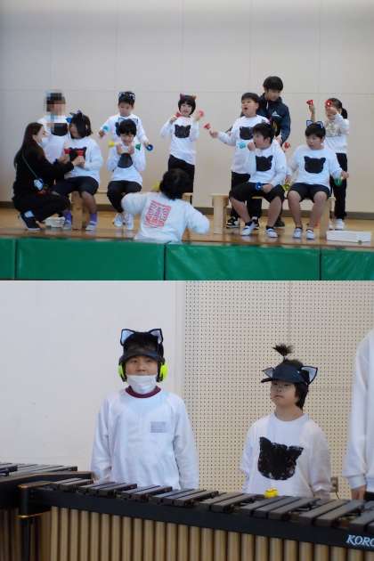 体育館で本番通りに器楽演奏や歌唱の練習をしました。器楽演奏では、それぞれの楽器を演奏したり、タイミングよくたたいたりしていました。歌唱は、みんなそろって歌ったり、体を揺らしたりして表現していました。
